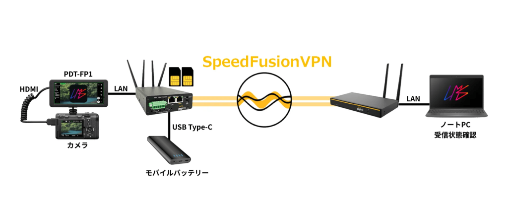 今回は、カメラに接続された端末(PDT-FP1)と受信側となるPCにLMSをインストールし、現場での映像を拠点に送信する一般的な伝送環境を構築しました。 その間にはPeplinkのMAX Transit Duo ProとB Oneを設置し、SpeedFusionVPNを構築することでMAX Transit Duo Proに挿入されている2枚のSIMをボンディングし、安定した通信を構築します。