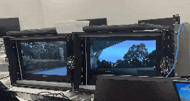 かごの中に現場側の機材を入れて、簡易的な可搬システムとして現場を再現し、リアルタイムで送られる映像を目視で確認します。