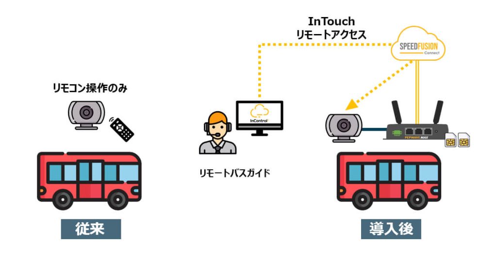 そこで、PeplinkルーターとInTouchを導入することで、移動中の通信の改善に加えて、車内カメラの遠隔操作・監視が有効になり、トラブルシューティングの品質向上や現場の人の負担軽減に貢献することが出来ました。