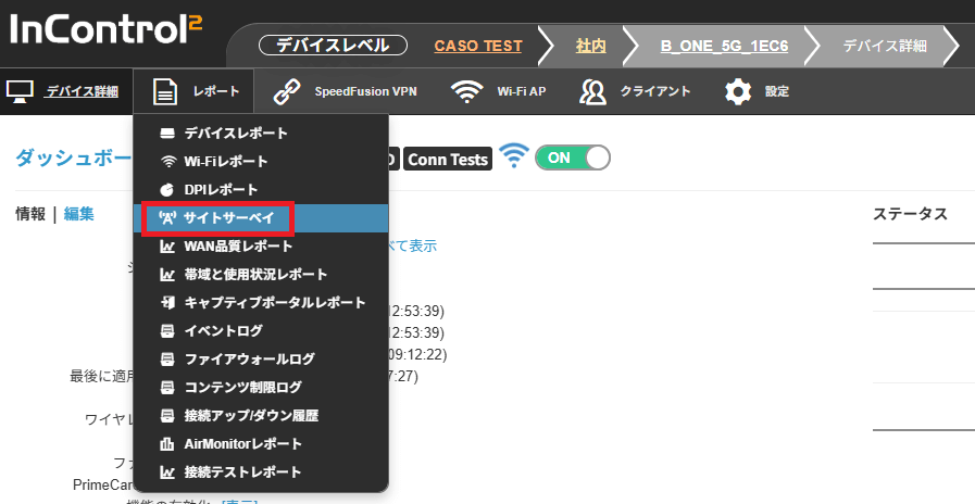 対応デバイスの個別ページを開き、レポート > サイトサーベイを押下します。