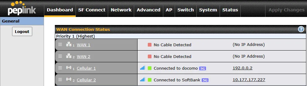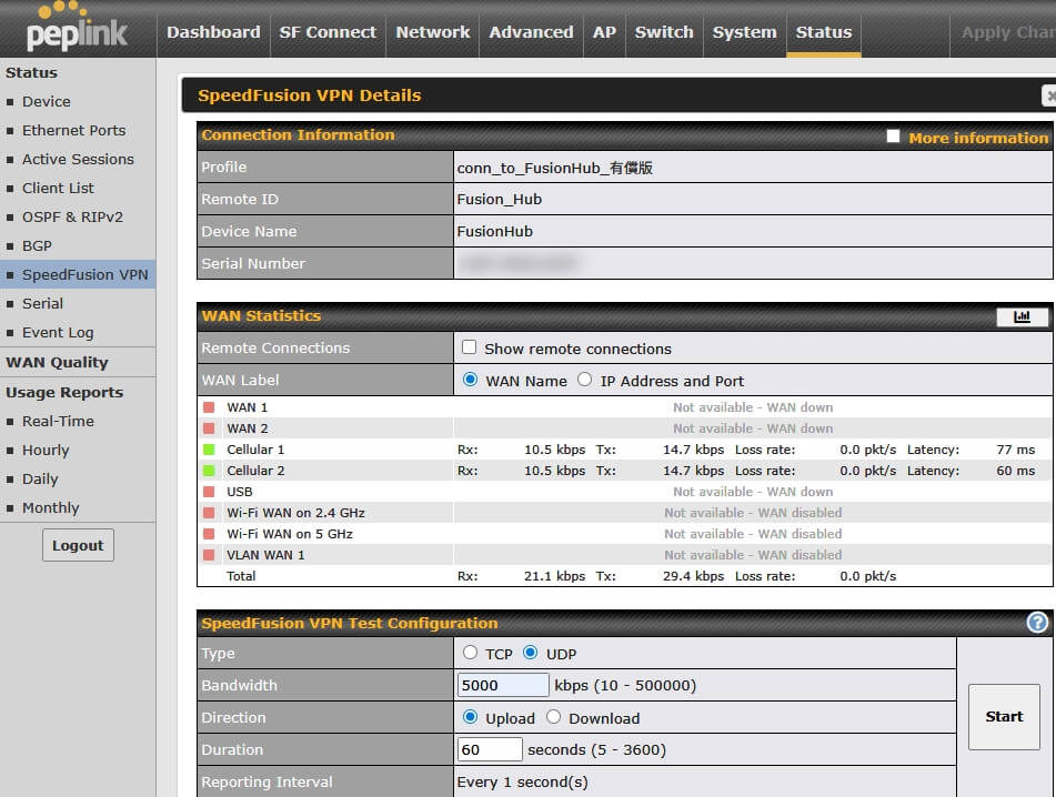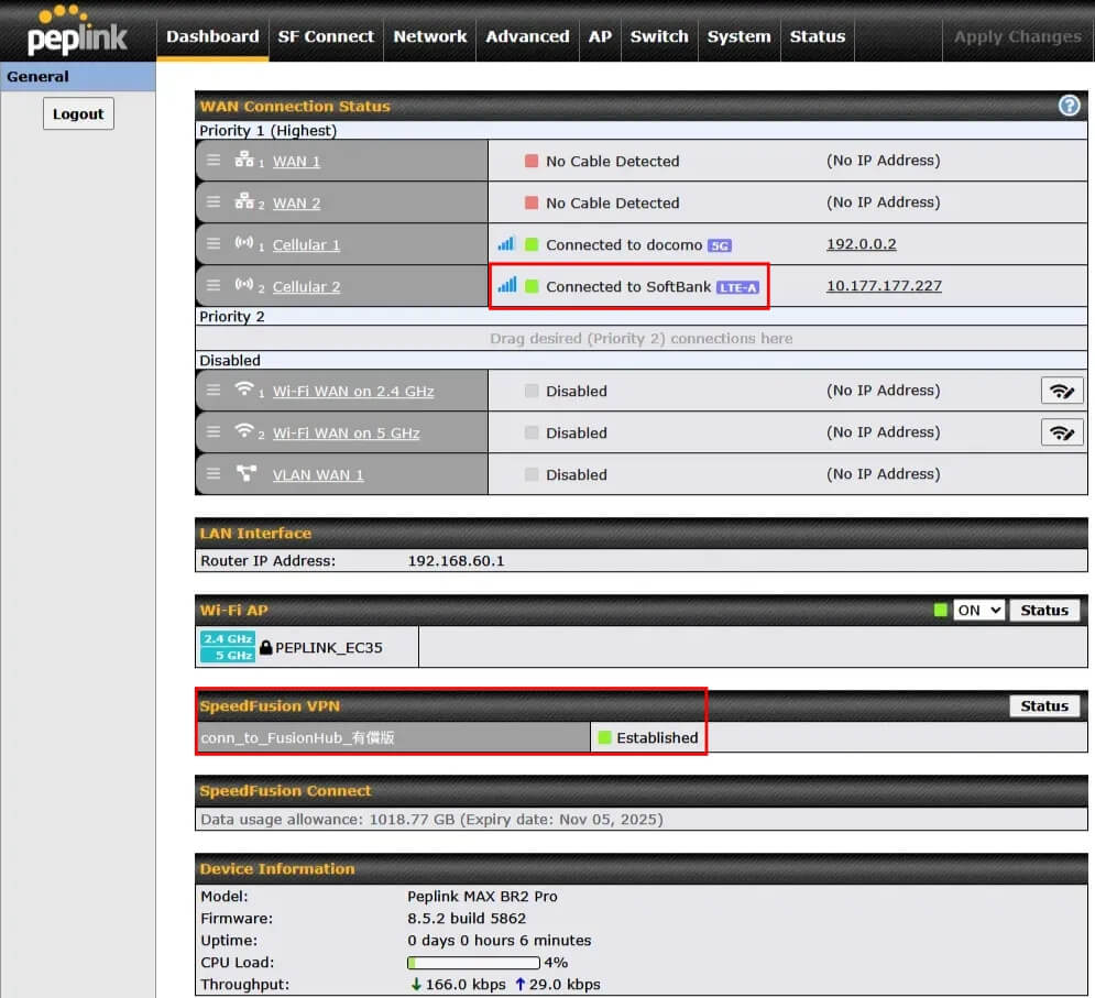 SpeedFusion VPNはFusionHubが「🟩Established」となっておりVPN接続は問題ないですが、Cellular2がLTE-Aとなっています。
