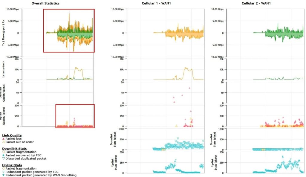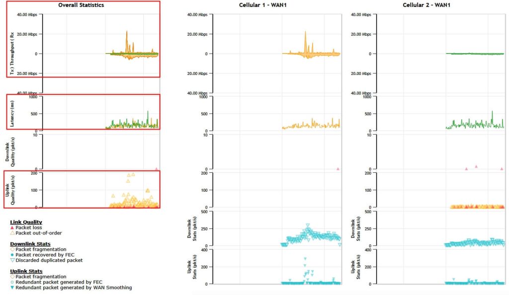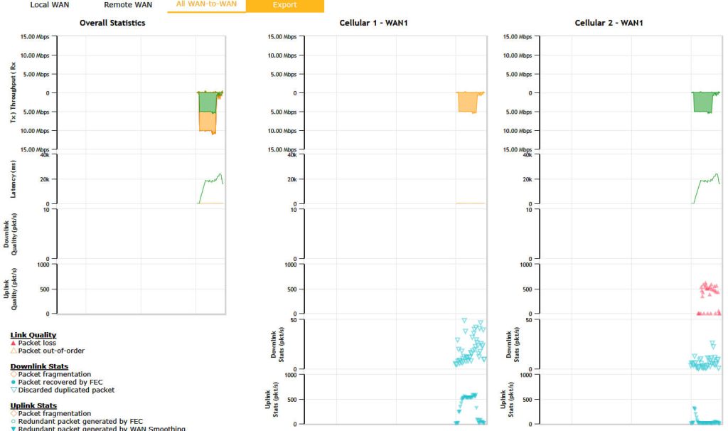 WAN Smoothingにより各WAN回線のCellularにデータが複製されて送られる為、映像が止まる事無く流れています。