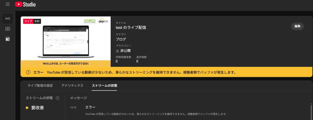 Youtube Studio上でもストリームの状態は要改善のメッセージが出てしまっています。