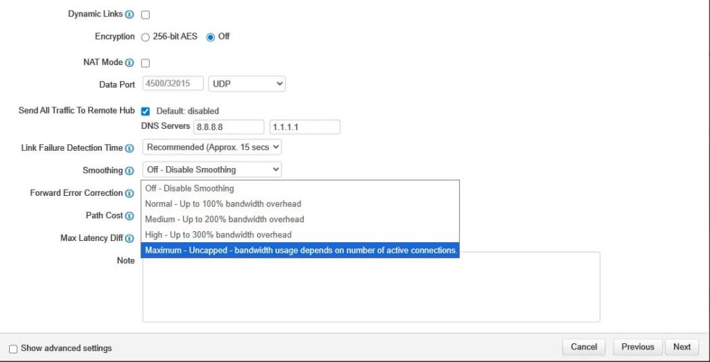 では対策としてSpeedFusion VPNのプロファイルからWAN SmoothingをMaximumに設定してみます。