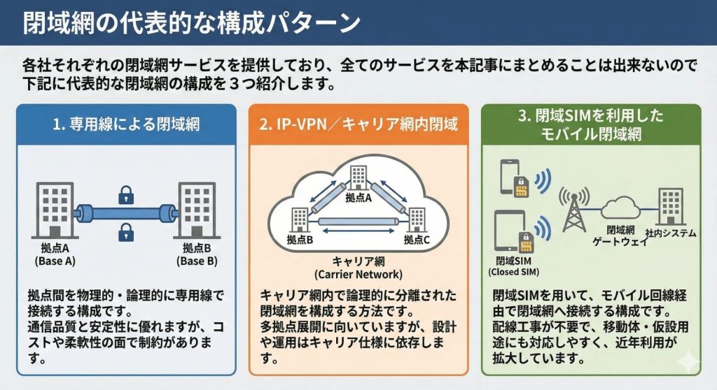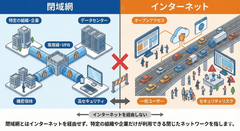 なお、「閉域網」は特定の技術名称ではなく、複数の構成を含む概念的な呼び方です。