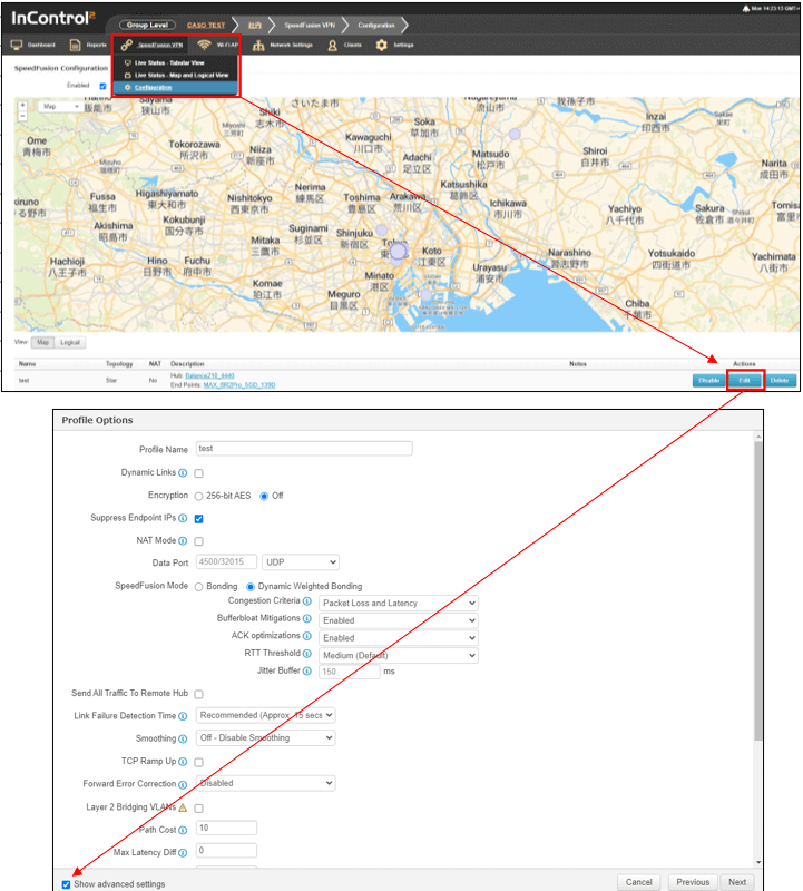 InControl2のSpeedFusionVPN>Configrationをクリック後、該当のVPNプロファイルのEditボタンをクリックし、Nextを2回クリックするとVPNプロファイルが表示されます。