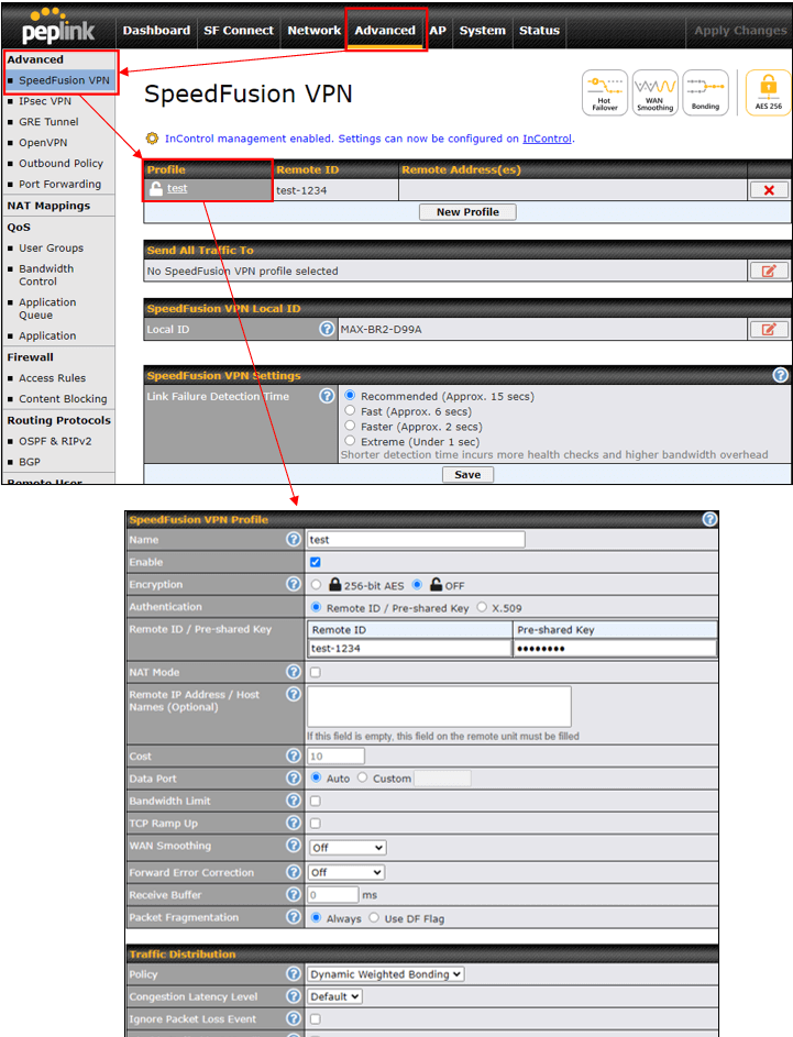 PeplinkルーターのWebAdminにログイン後、Advanced>SpeedFusionVPNクリック後、設定済みのVPNプロファイル名をクリックします。