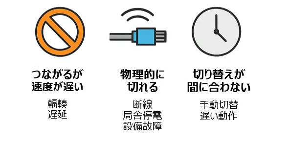 - 切り替えが間に合わない:バックアップ回線があっても、手動切替や復旧が遅い