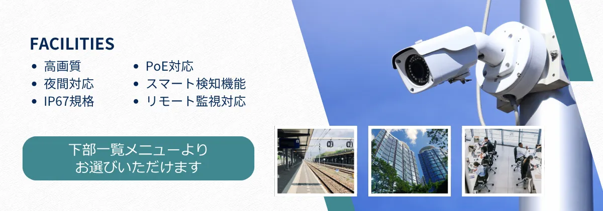 屋内外の設置環境や用途に応じて選べるネットワークカメラを豊富にラインナップ。フルHD画質、PoE対応、防水仕様(IP67)など、高い信頼性と簡単な設置を両立し、さまざまな監視ニーズに対応します。